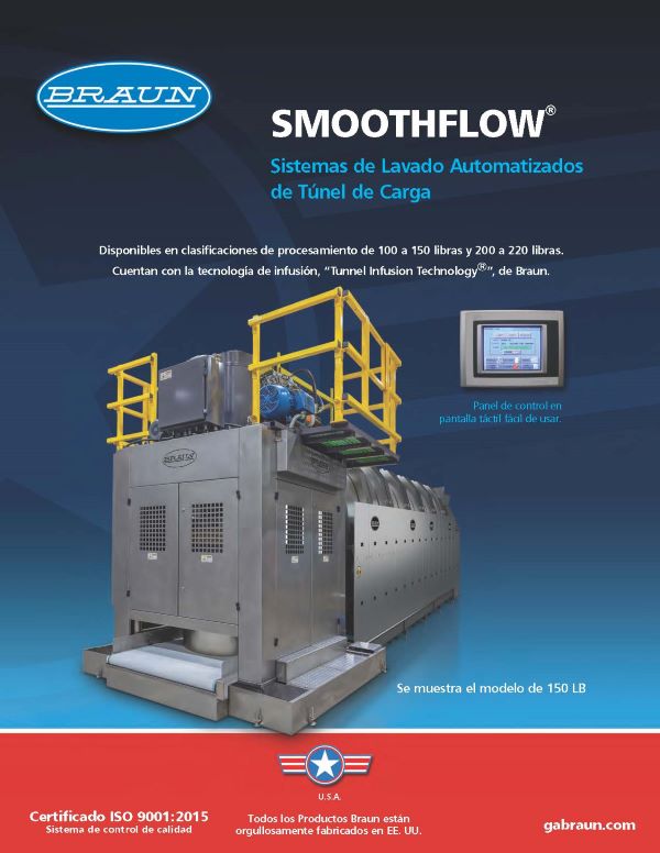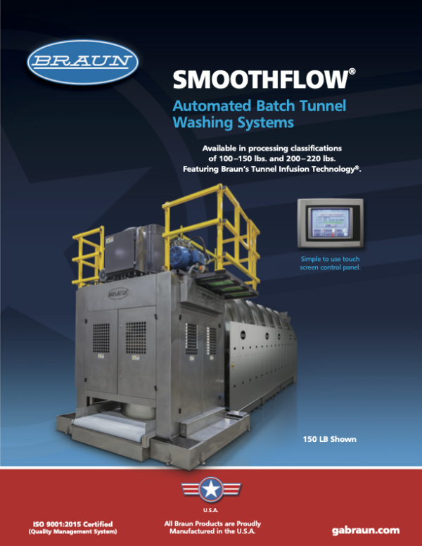 Braun SmothFlow® Batch Tunnel Washer Systems are available in processing capacities of 100 – 130, 150 and 220 lbs. Throughout its continuous processing, the Braun Tunnel Washer consistently delivers clean goods with error-free batch transfer. The one-piece, single-drum design is proven in hundreds of installations worldwide.